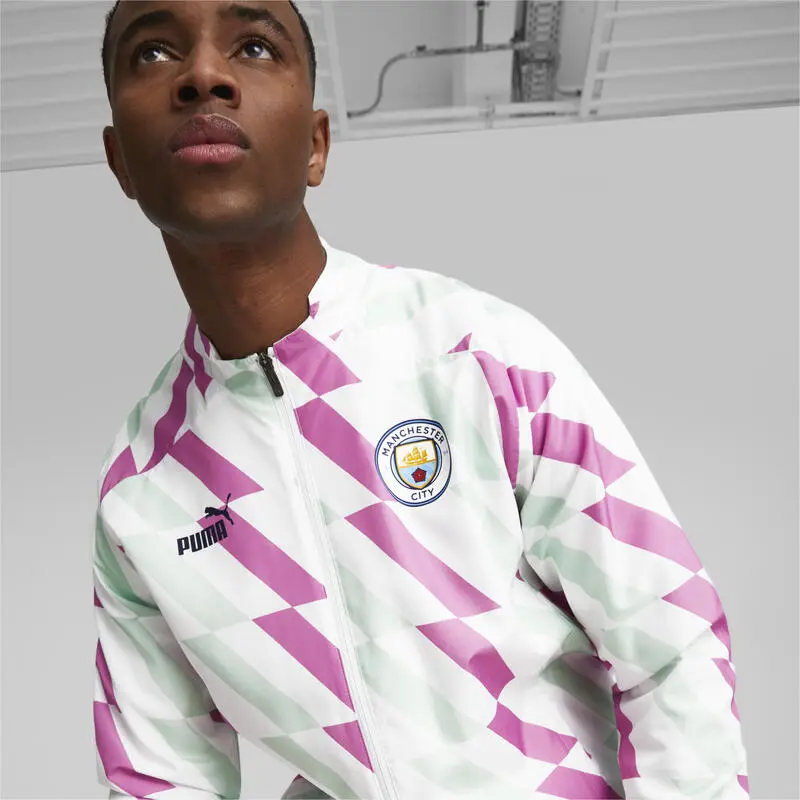 Compra en Decathlon Chaqueta prepartido Hombre Manchester City PUMA Inspirada en Emmeline Pankhurst, que contribuyó a crear el movimiento de las sufragistas del Reino Unido, la colección prepartido del Man City para esta temporada rinde homenaje a los orígenes