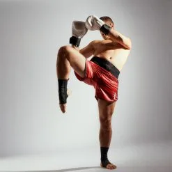 Compra en Decathlon Short pantalon corto muy thai kick boxing Outshock 900 rojo Para el practicante de Muay Thai que busca un short tradicional para realizar los golpes de rodillas y pies sin molestias.